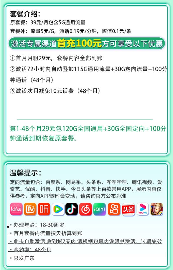 第1-48个月29元包120G全国通用+30G全国定向+100分钟通话到期恢复原套餐(激活时需上传学生证录取通知书/学信网等学生证明)